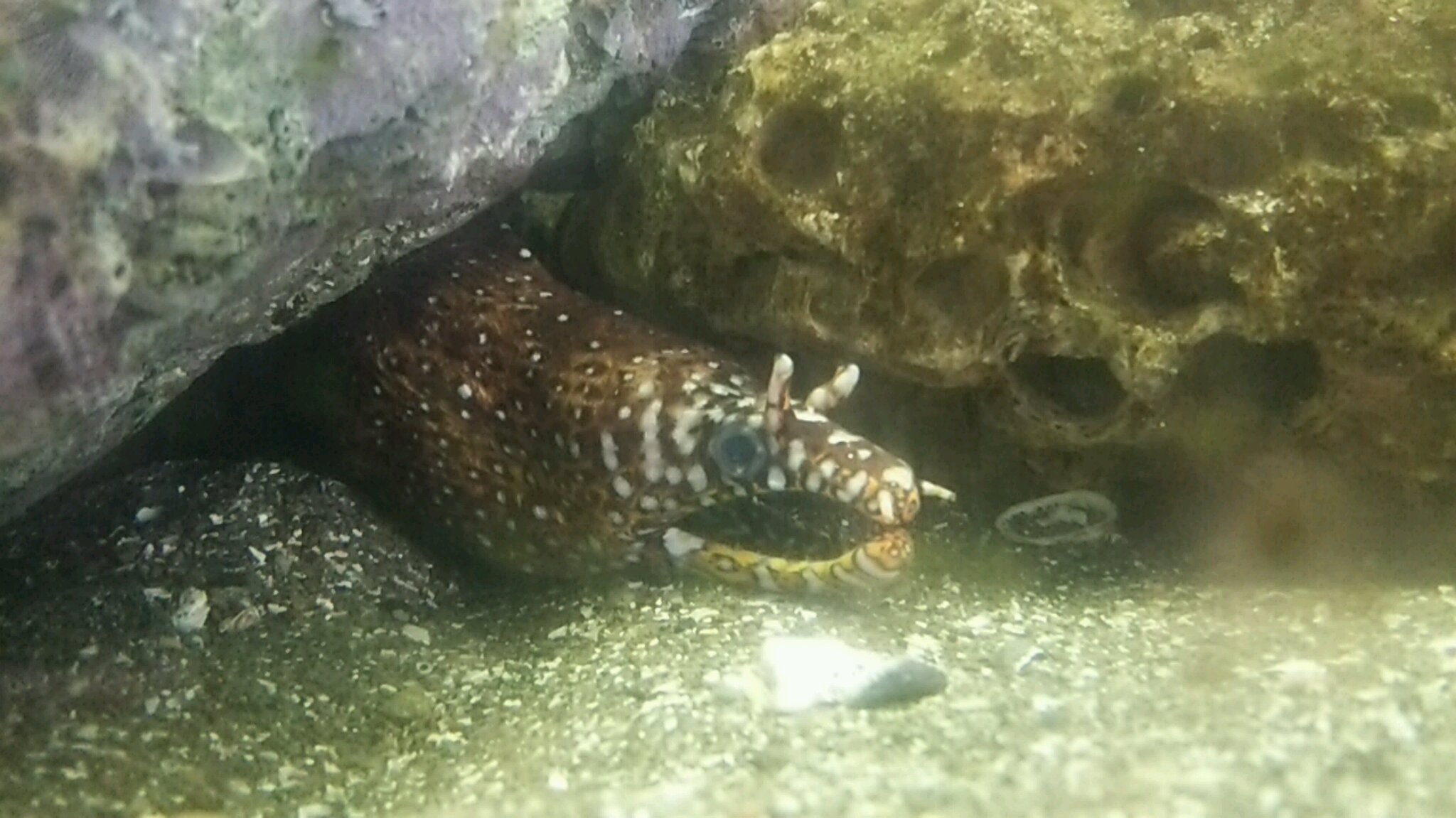 いつも4号館のオーバーフロー水槽に居て、岩の陰から顔を出しています。