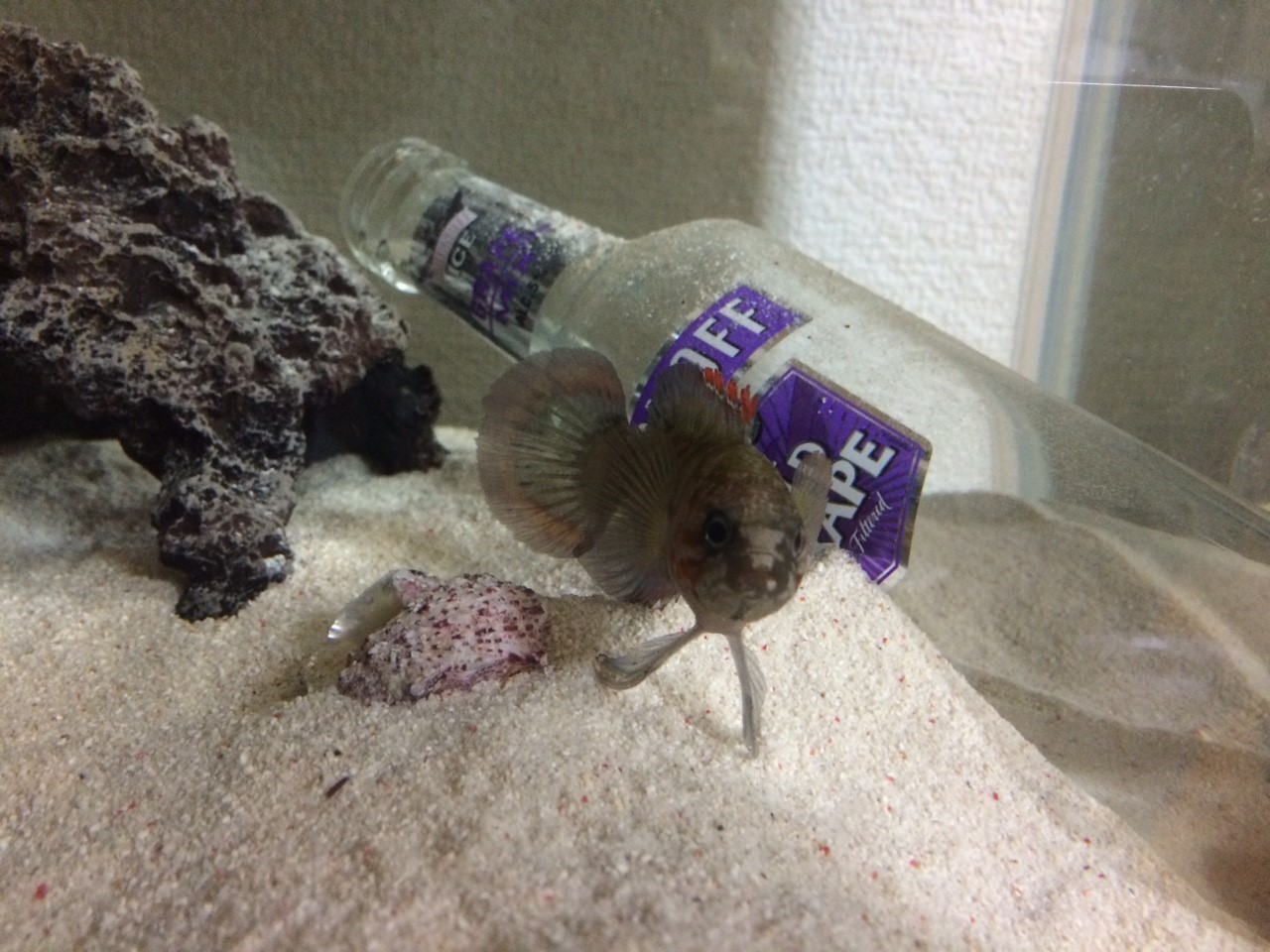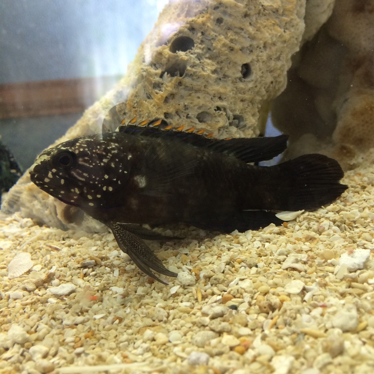 普段は岩の陰、隙間に潜み、岩をどかすと目と目が合う。そして瞬時によその岩陰へと消えます。普段遊泳しないが、逃げる時と摂餌の時はシャトルのようです。エサを水面に浮かべると、狙いを定め、約一秒というわずかな時間でエサを取り元の居場所に戻るという早業。勢いがよすぎるため、海水が飼い主にかかる。たまにエサが取れてないというへたくそ。