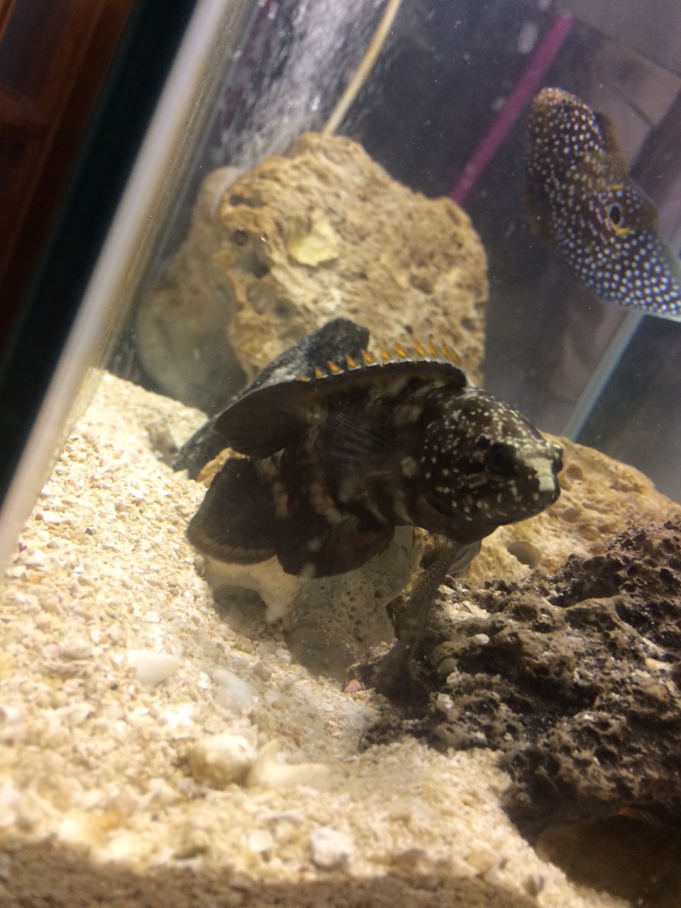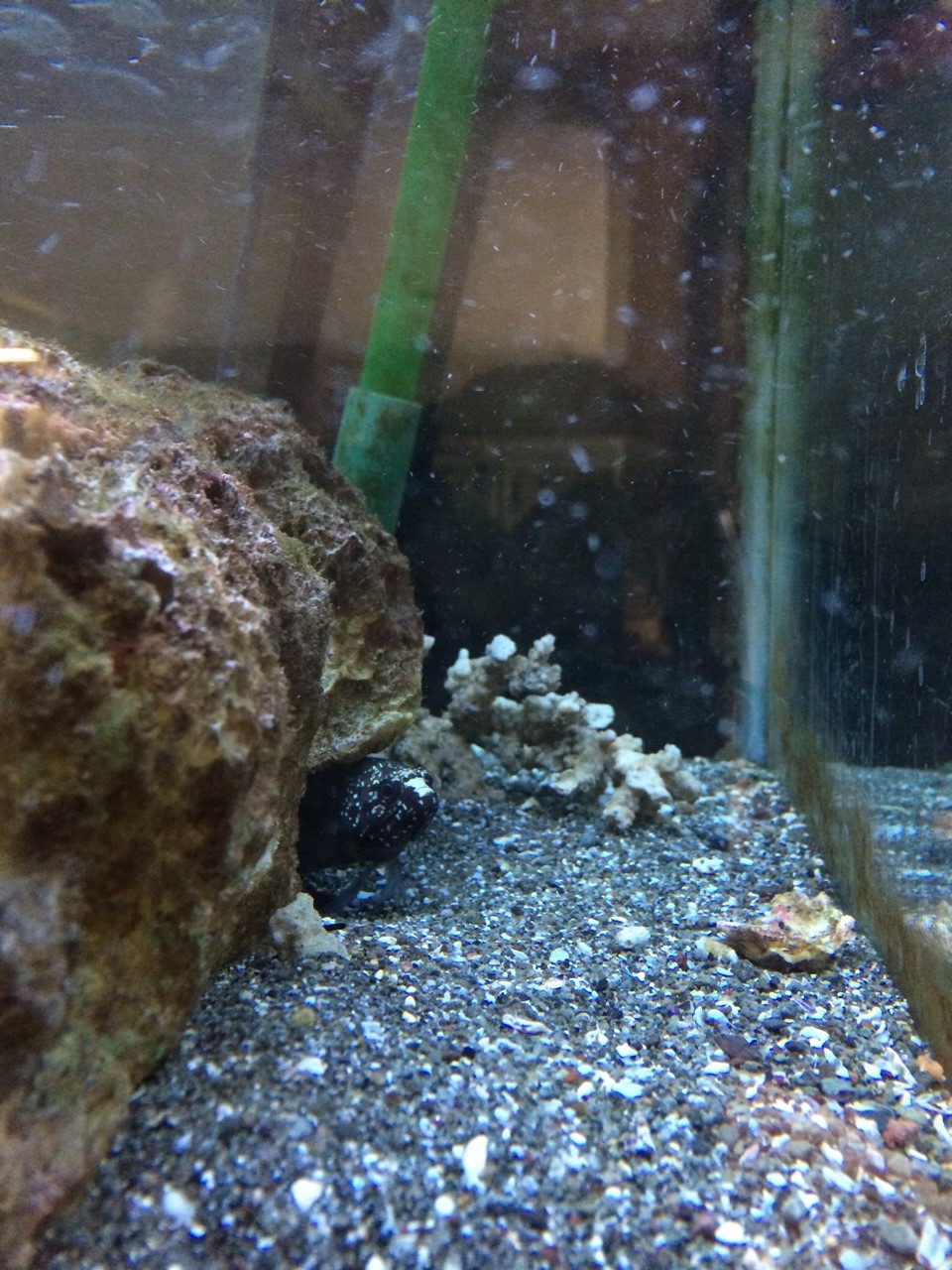 普段は岩の陰、隙間に潜み、岩をどかすと目と目が合う。そして瞬時によその岩陰へと消えます。普段遊泳しないが、逃げる時と摂餌の時はシャトルのようです。エサを水面に浮かべると、狙いを定め、約一秒というわずかな時間でエサを取り元の居場所に戻るという早業。勢いがよすぎるため、海水が飼い主にかかる。たまにエサが取れてないというへたくそ。