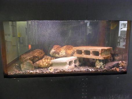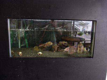 今回紹介する生物はちょいとマニアック生物、タナバタウオです。たなちゃん。4号館前の伊豆水槽の岩の下の隙間から頭を出しています。