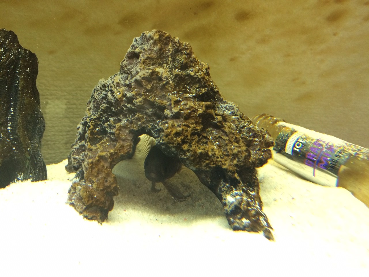 普段は岩の陰、隙間に潜み、岩をどかすと目と目が合う。そして瞬時によその岩陰へと消えます。普段遊泳しないが、逃げる時と摂餌の時はシャトルのようです。エサを水面に浮かべると、狙いを定め、約一秒というわずかな時間でエサを取り元の居場所に戻るという早業。勢いがよすぎるため、海水が飼い主にかかる。たまにエサが取れてないというへたくそ。